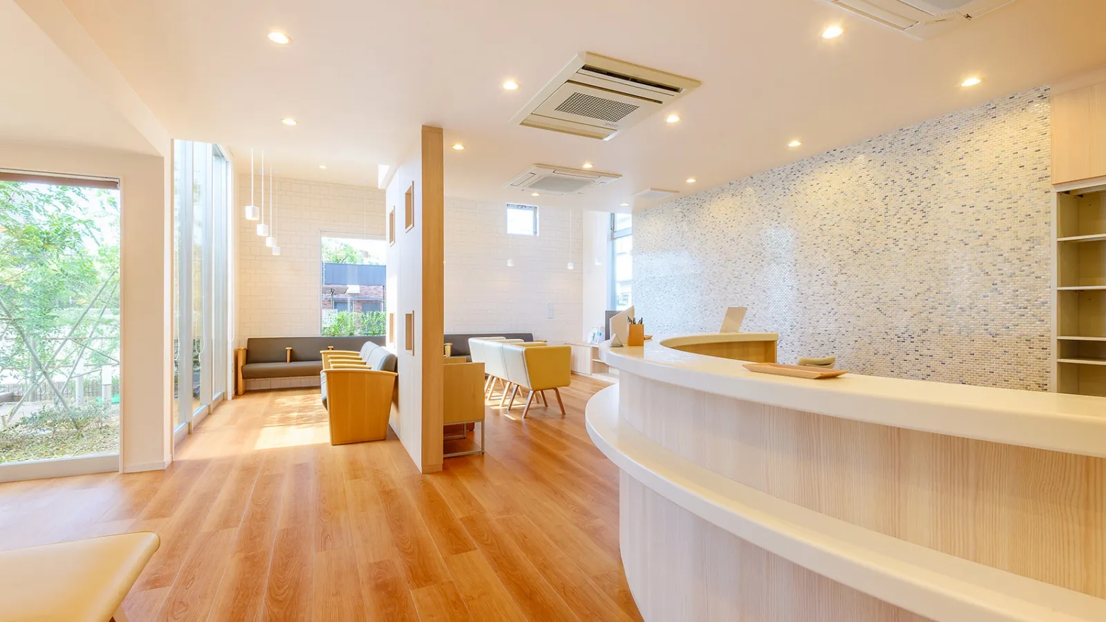 白・淡いブルー・グリーンを基調に、医療機関らしい清潔で落ち着いた印象を演出します。